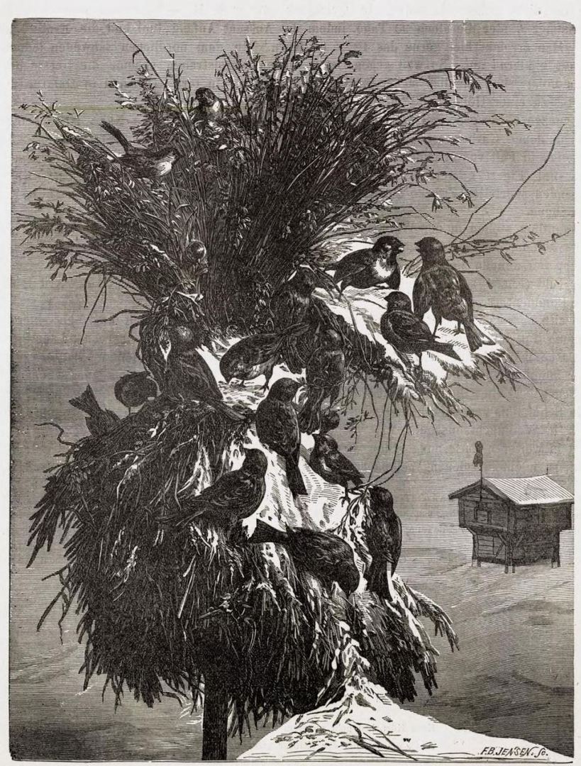 Lithographie aus Dr. Schübelers Buch über norwegische Botanik, die den Brauch veranschaulicht, Vögel zu Weihnachten mit Getreidebüscheln zu füttern: "Das Bild, nach einem Gemälde des geschätzten