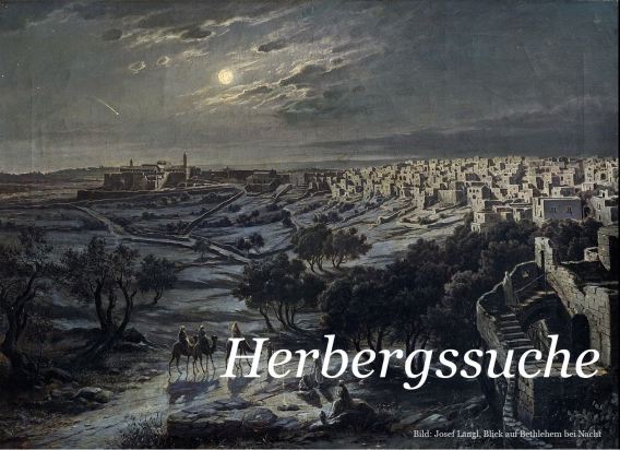 Die Bilder illustrieren die Reise von Maria und Josef nach Bethlehem und ihre vergebliche Suche nach einer Unterkunft.