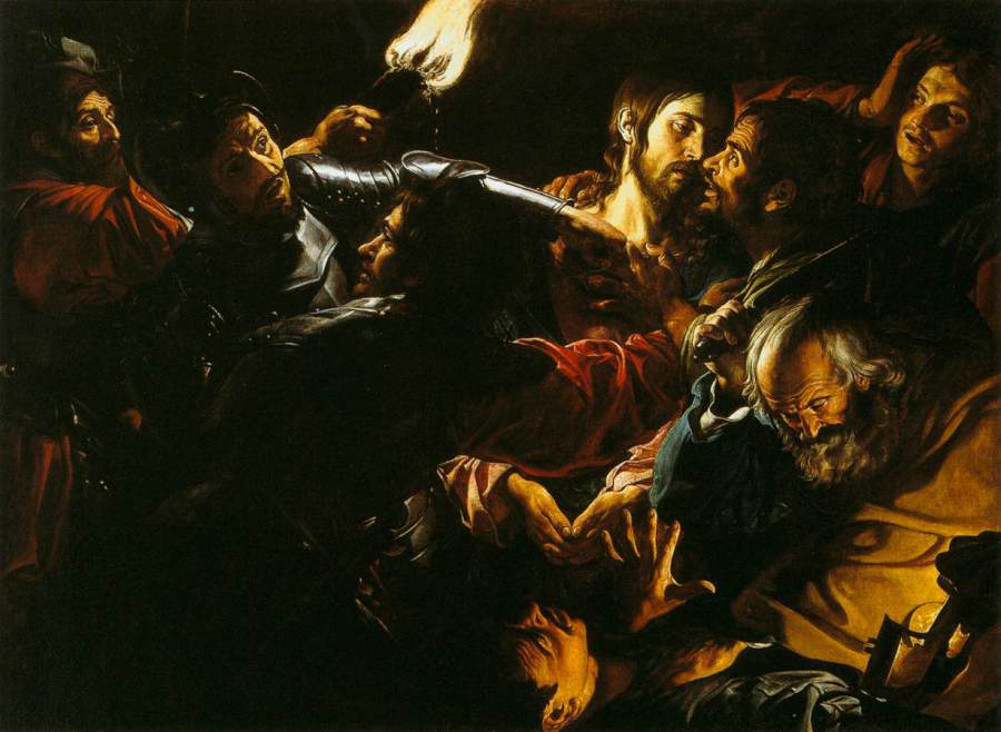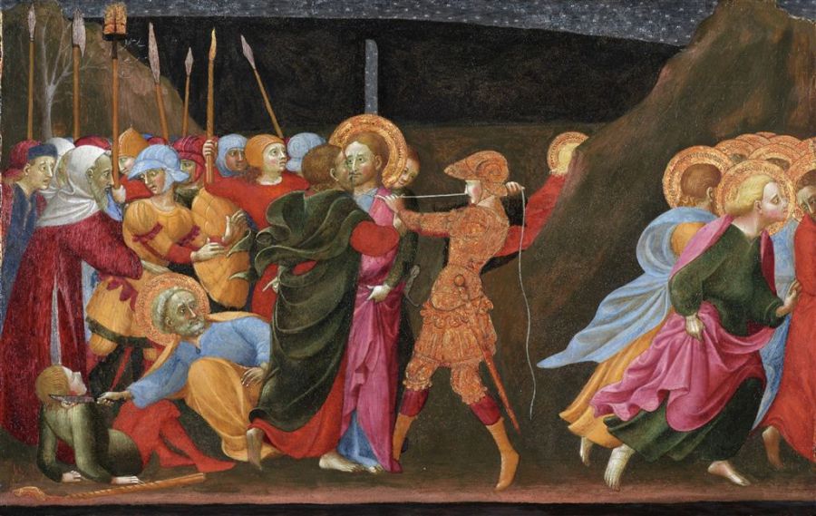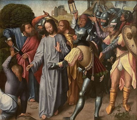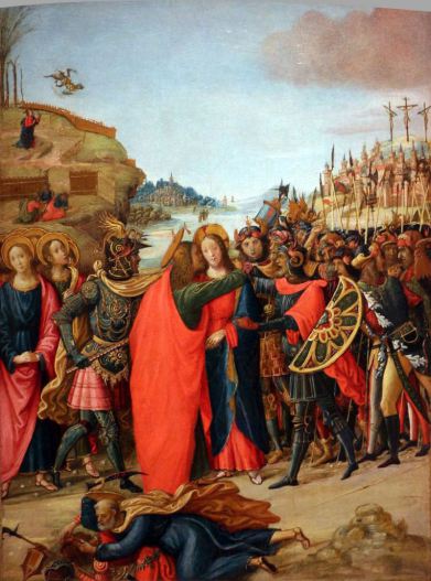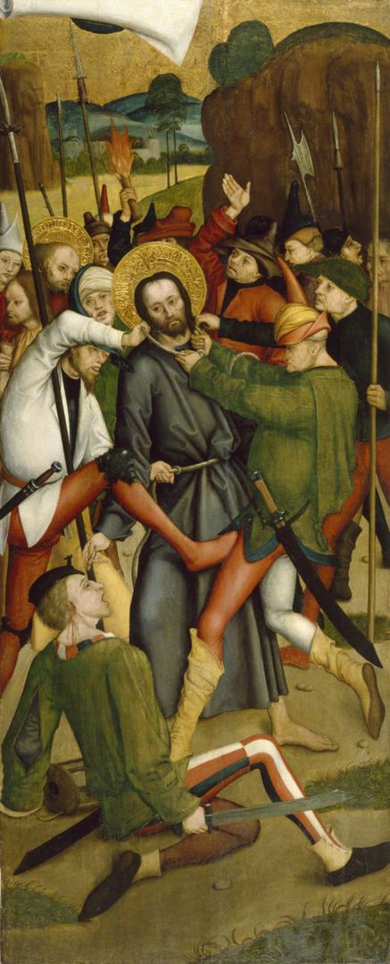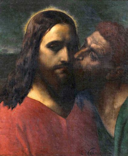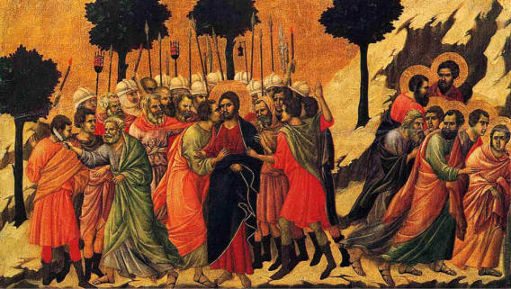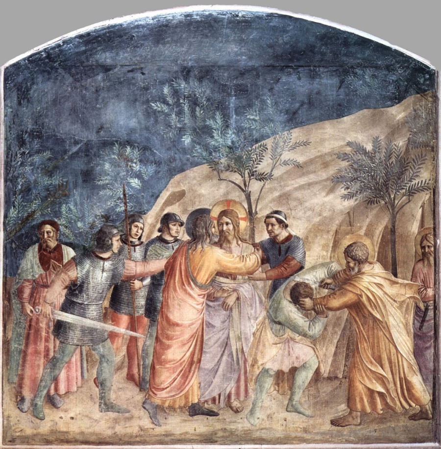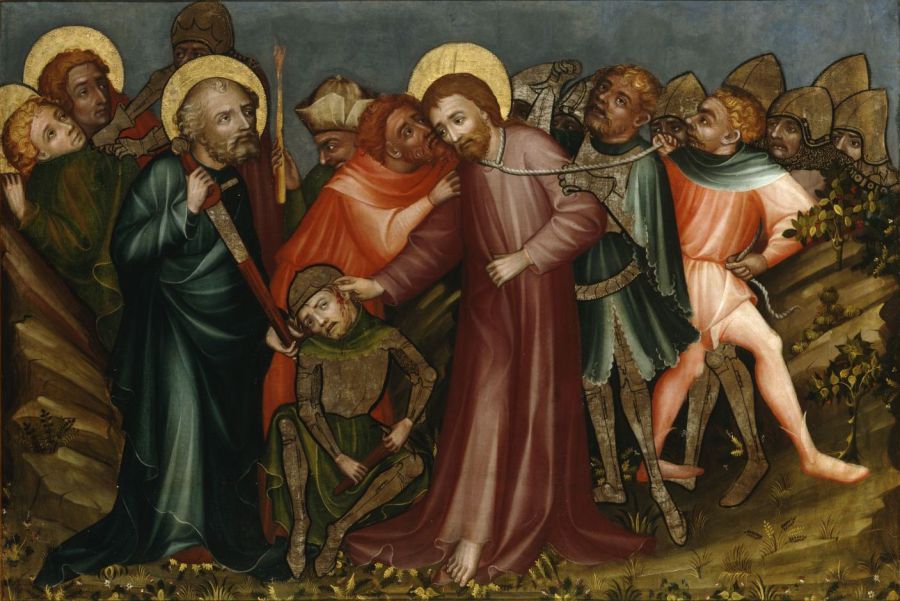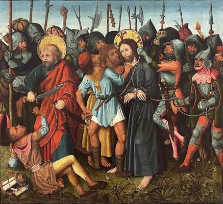 Lk 22, 47 Noch während er redete, siehe, da kam eine Schar Männer; und der Judas hieß, einer der Zwölf, ging ihnen voran. Er näherte sich Jesus, um ihn zu küssen. 48 Jesus aber sagte zu ihm: Judas, mit einem Kuss lieferst du den Menschensohn aus? 49 Als seine Begleiter merkten, was bevorstand, fragten sie: Herr, sollen wir mit dem Schwert dreinschlagen? 50 Und einer von ihnen schlug auf den Diener des Hohepriesters ein und hieb ihm das rechte Ohr ab. 51 Da sagte Jesus: Lasst es! Nicht weiter! Und er berührte das Ohr und heilte den Mann.