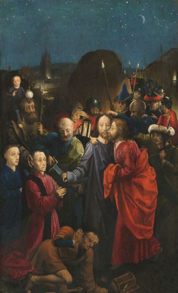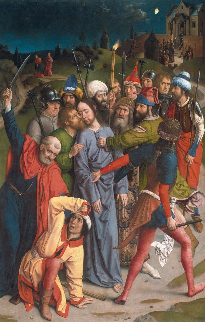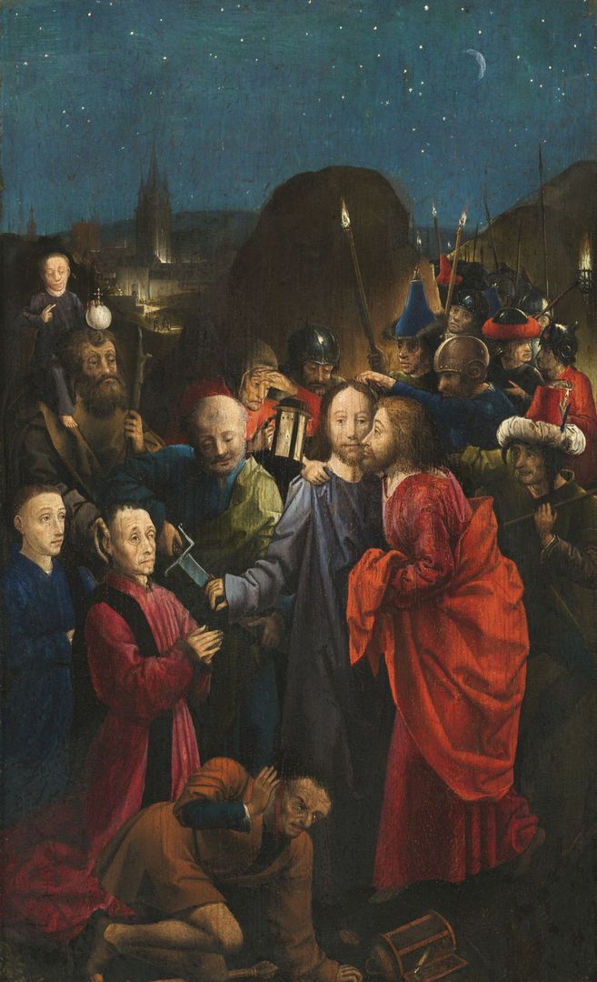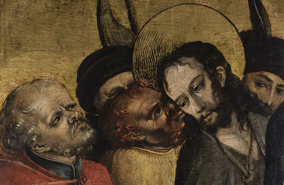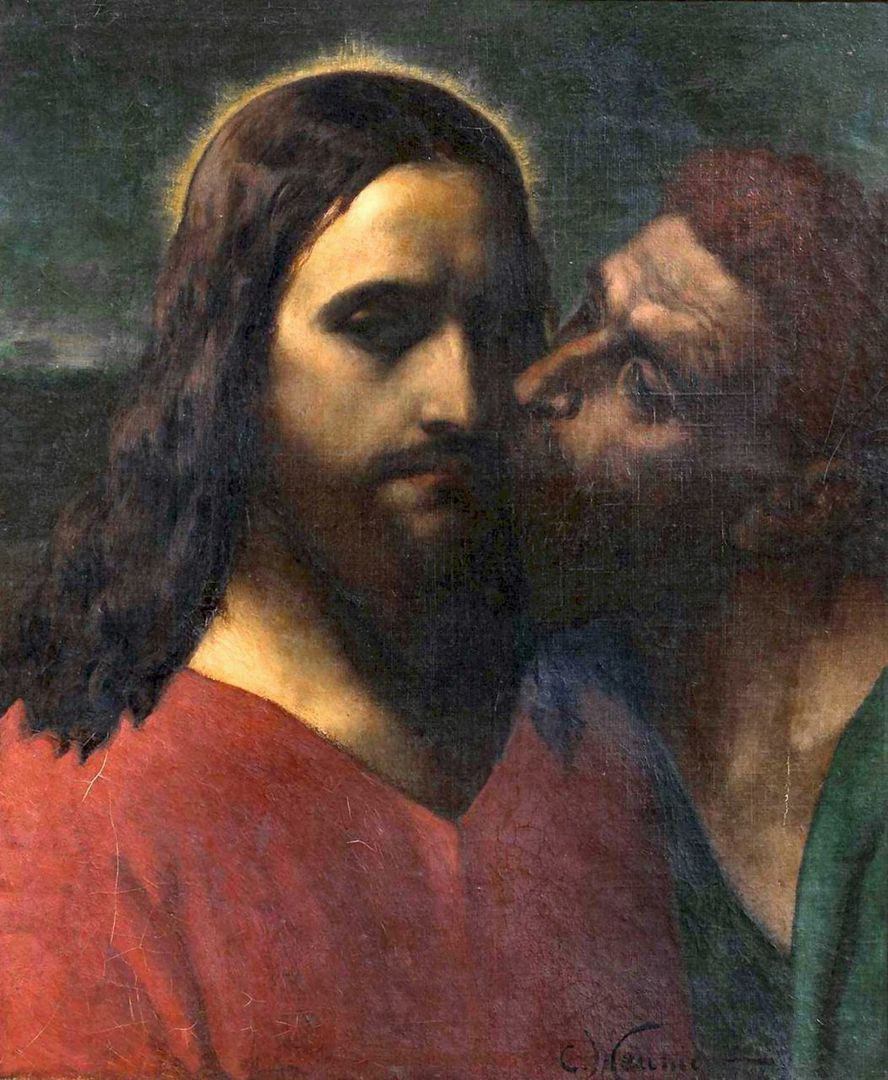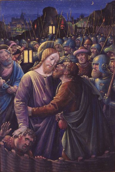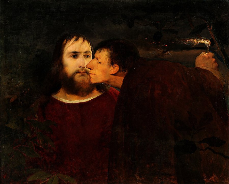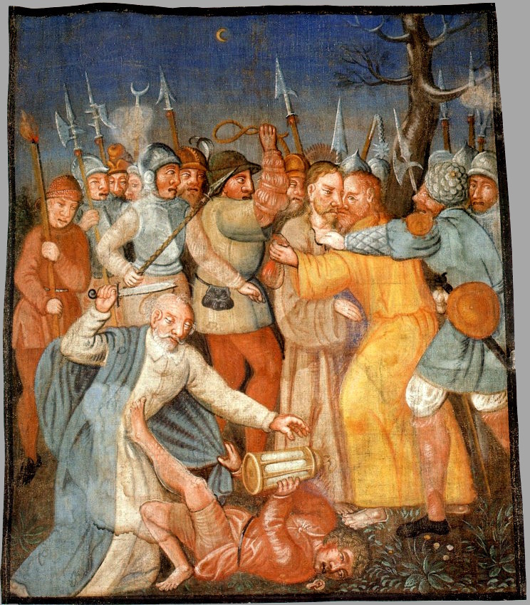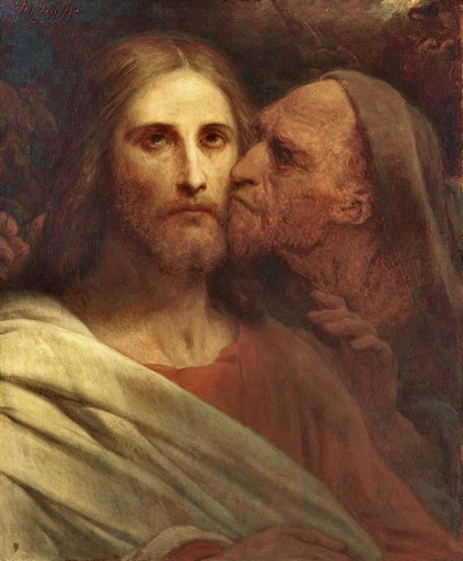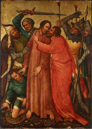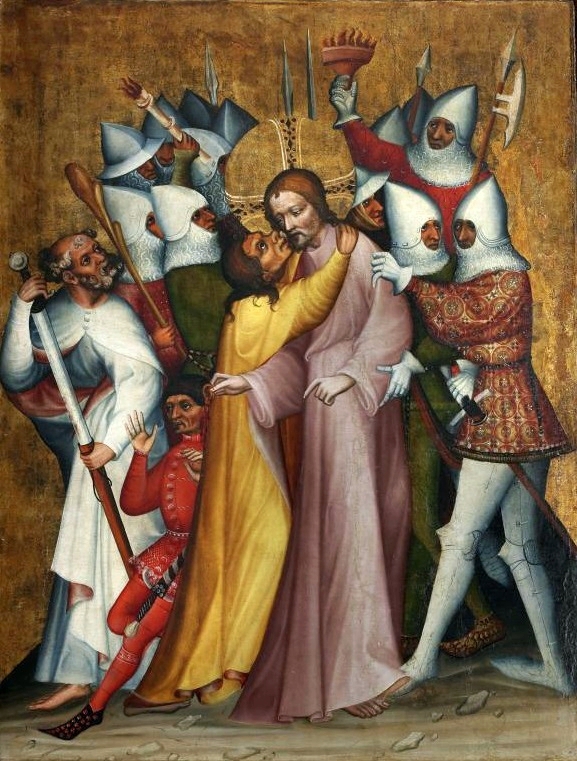 Mk 14 43 Noch während er redete, kam Judas, einer der Zwölf, mit einer Schar von Männern, die mit Schwertern und Knüppeln bewaffnet waren; sie waren von den Hohepriestern, den Schriftgelehrten und den Ältesten geschickt worden. 44 Der ihn auslieferte, hatte mit ihnen ein Zeichen vereinbart und gesagt: Der, den ich küssen werde, der ist es. Nehmt ihn fest, führt ihn sicher ab! 45 Und als er kam, ging er sogleich auf Jesus zu und sagte: Rabbi! Und er küsste ihn.