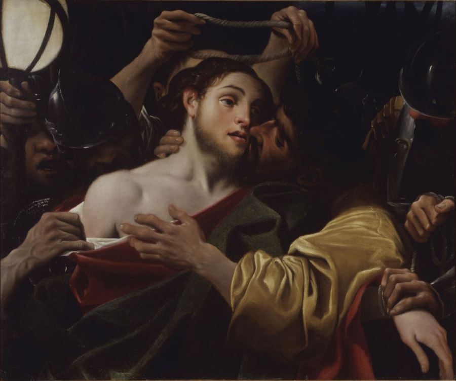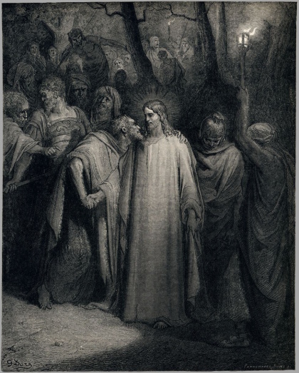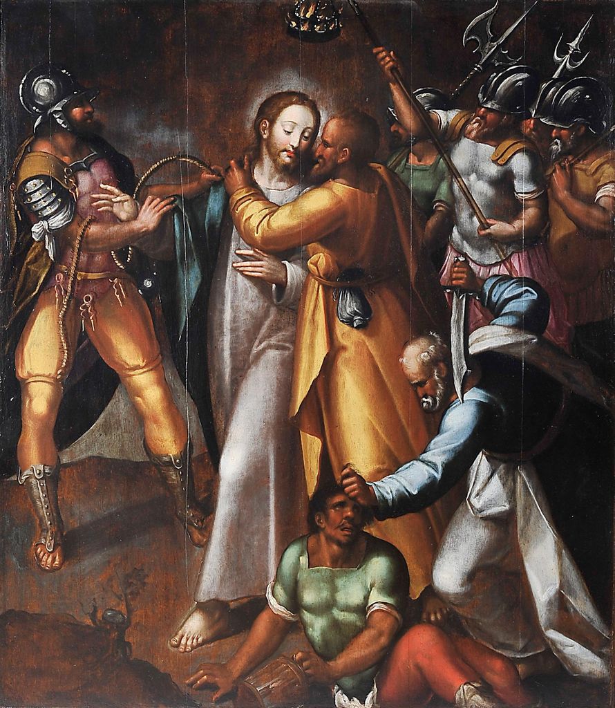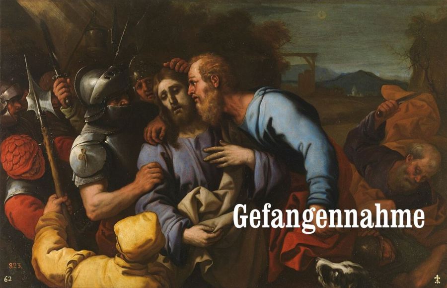 Mt 26, 47 Noch während er redete, siehe, da kam Judas, einer der Zwölf, mit einer großen Schar von Männern, die mit Schwertern und Knüppeln bewaffnet waren; sie waren von den Hohepriestern und den Ältesten des Volkes geschickt worden. 48 Der ihn auslieferte, hatte mit ihnen ein Zeichen vereinbart und gesagt: Der, den ich küssen werde, der ist es; nehmt ihn fest! 49 Sogleich ging er auf Jesus zu und sagte: Sei gegrüßt, Rabbi! Und er küsste ihn. 50 Jesus erwiderte ihm: Freund, dazu bist du gekommen? Da gingen sie auf Jesus zu, ergriffen ihn und nahmen ihn fest.