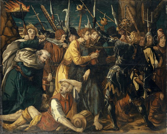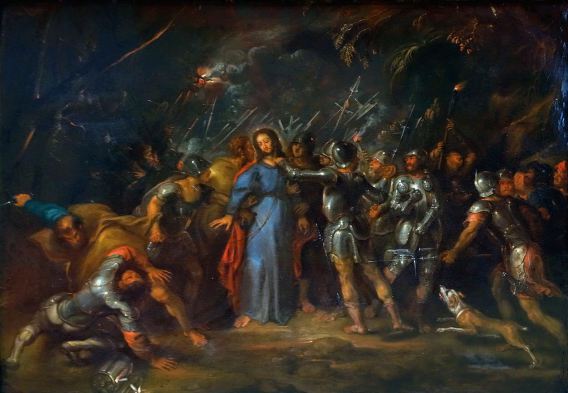 Joh 18, 1 Nach diesen Worten ging Jesus mit seinen Jüngern hinaus, auf die andere Seite des Baches Kidron. Dort war ein Garten; in den ging er mit seinen Jüngern hinein. 2 Auch Judas, der ihn auslieferte, kannte den Ort, weil Jesus dort oft mit seinen Jüngern zusammengekommen war.3 Judas holte die Soldaten und die Gerichtsdiener der Hohepriester und der Pharisäer und kam dorthin mit Fackeln, Laternen und Waffen. 4 Jesus, der alles wusste, was mit ihm geschehen sollte, ging hinaus und fragte sie: Wen sucht ihr? 5 Sie antworteten ihm: Jesus von Nazaret. Er sagte zu ihnen: Ich bin es. Auch Judas, der ihn auslieferte, stand bei ihnen.
