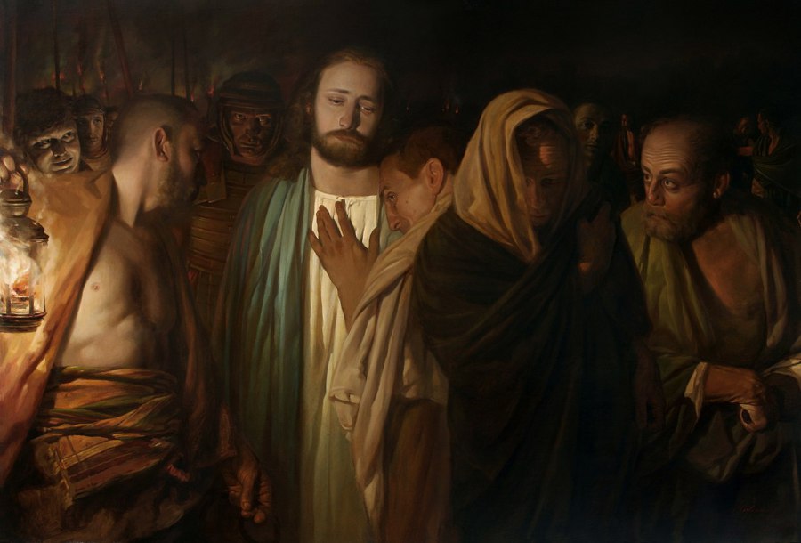 Lk 22, 52 Zu den Hohepriestern aber, den Hauptleuten der Tempelwache und den Ältesten, die vor ihm standen, sagte Jesus: Wie gegen einen Räuber seid ihr mit Schwertern und Knüppeln ausgezogen. 53 Tag für Tag war ich bei euch im Tempel und ihr habt nicht Hand an mich gelegt. Aber das ist eure Stunde und die Macht der Finsternis. 54 Darauf nahmen sie ihn fest, führten ihn ab und brachten ihn in das Haus des Hohepriesters. Petrus folgte von Weitem.