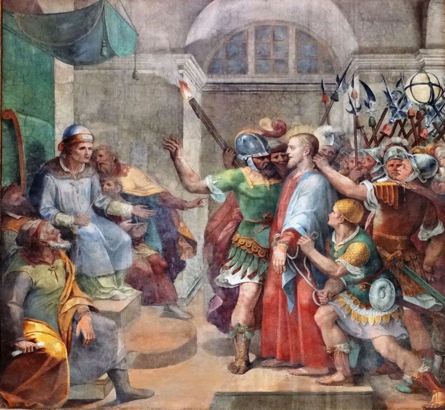 Gerichtsdiener der Juden nahmen Jesus fest, fesselten ihn 13 und führten ihn zuerst zu Hannas; er war nämlich der Schwiegervater des Kajaphas, der in jenem Jahr Hohepriester war.