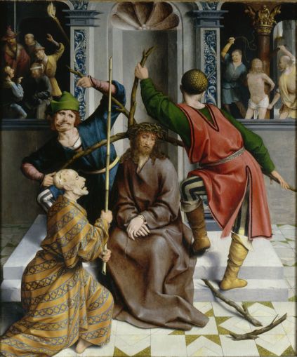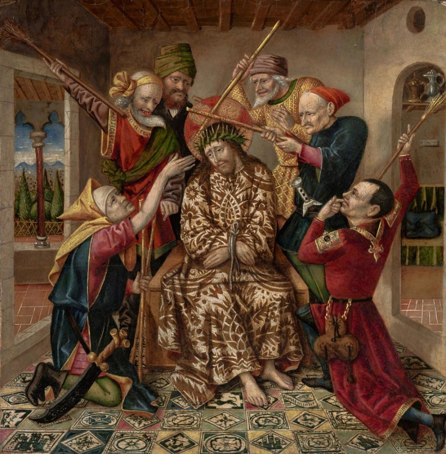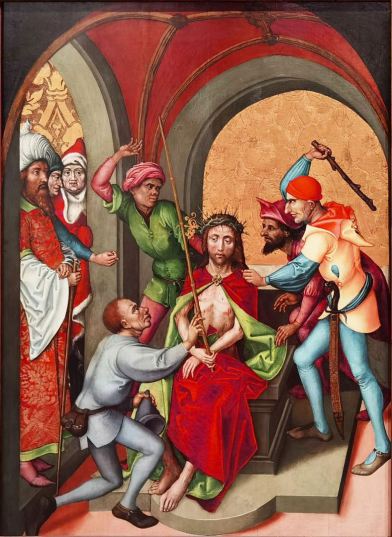 Mt 27 29 Dann flochten sie einen Kranz aus Dornen; den setzten sie ihm auf das Haupt und gaben ihm einen Stock in die rechte Hand. Sie fielen vor ihm auf die Knie und verhöhnten ihn, indem sie riefen: Sei gegrüßt, König der Juden! 30 Und sie spuckten ihn an, nahmen ihm den Stock wieder weg und schlugen damit auf seinen Kopf.
