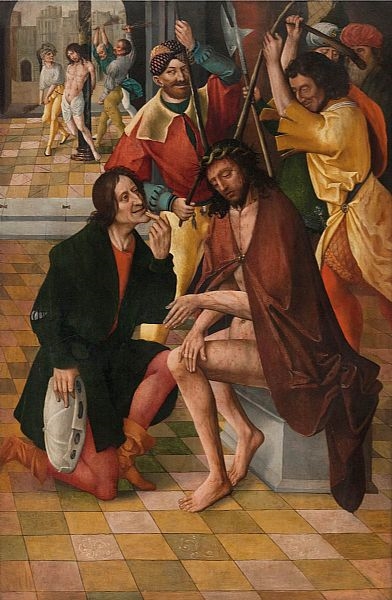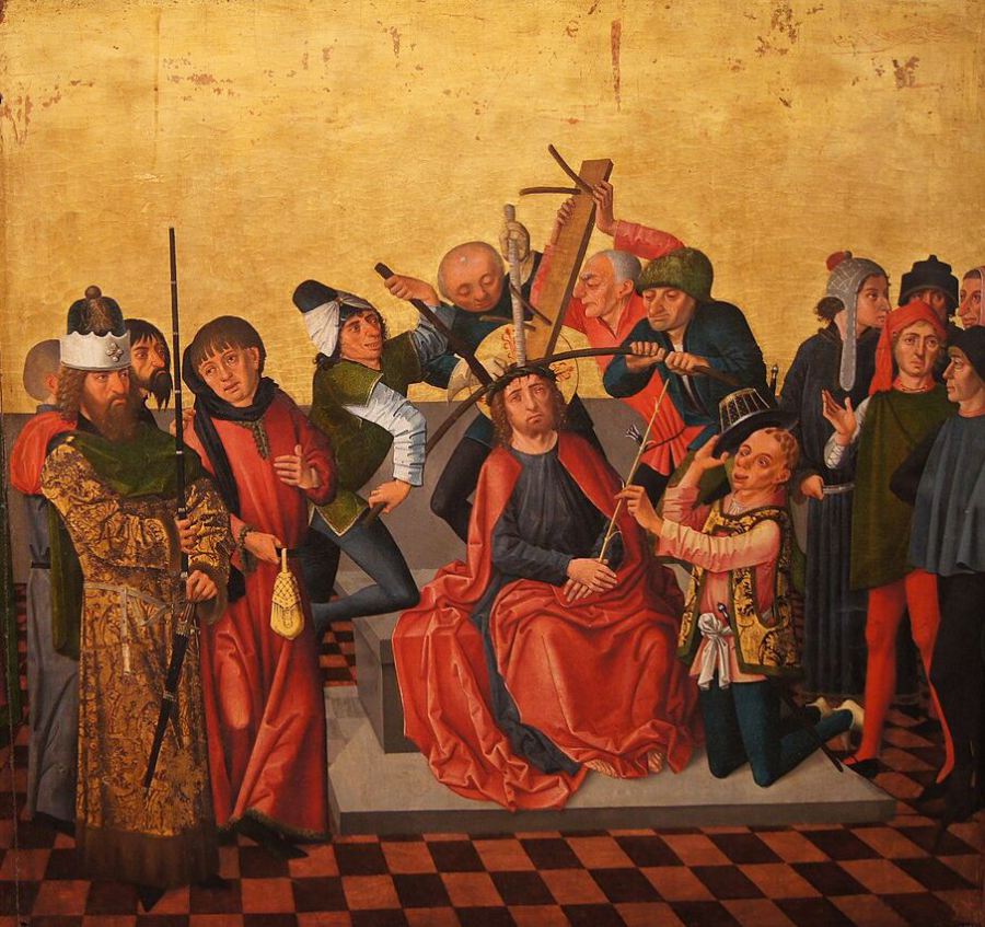 Mk 15 17 Dann legten sie ihm einen Purpurmantel um und flochten einen Dornenkranz; den setzten sie ihm auf 18 und grüßten ihn: Sei gegrüßt, König der Juden! 19 Sie schlugen ihm mit einem Stock auf den Kopf und spuckten ihn an, beugten die Knie und huldigten ihm.